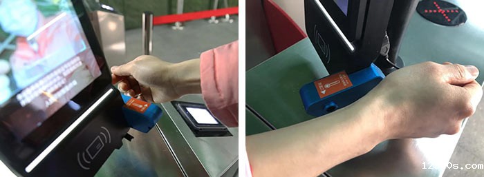 通过智能闸机时,将准备好的苏康码或已与苏康码绑定的身份证对准扫码区,苏康码验证通过后按语音提示伸出手腕对准右边测温面板进行体温检测。